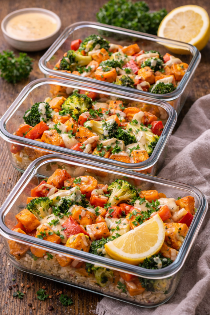 Knusprig gebackenes Gemüse kombiniert mit einem frischen Zitronen-Tahini-Dressing – sättigend, gesund und ideal zum Vorbereiten.