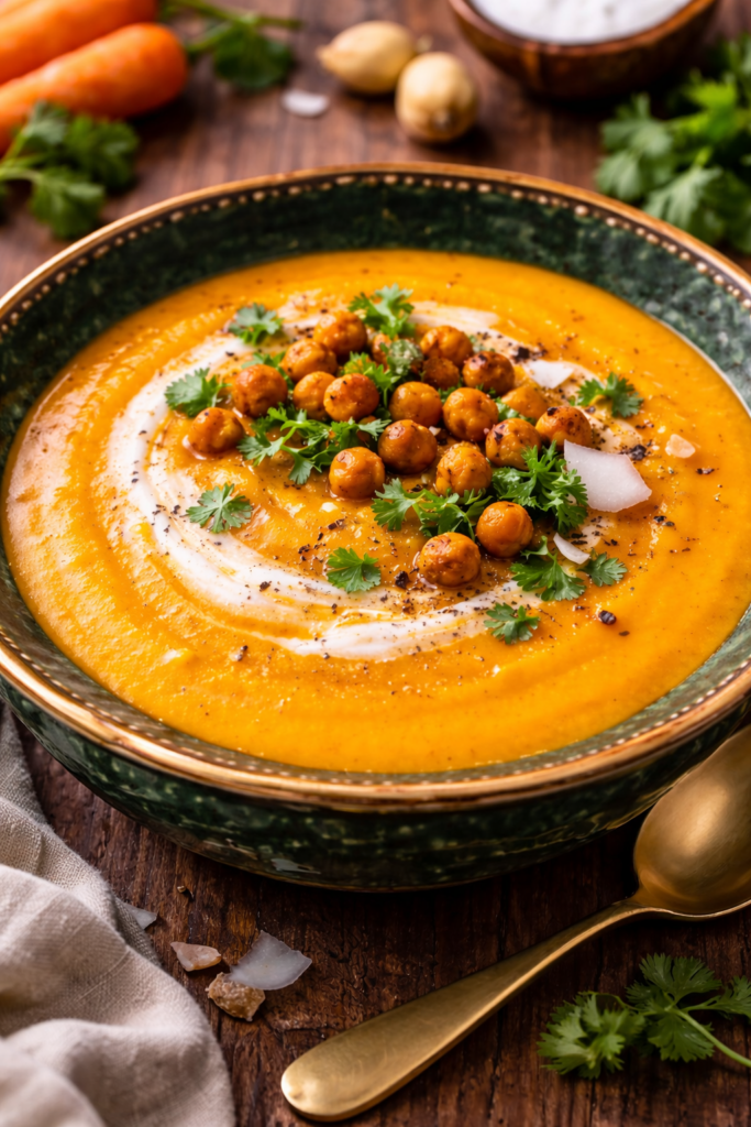 • Mit gerösteten Kichererbsen als Topping wird die Suppe noch sättigender.